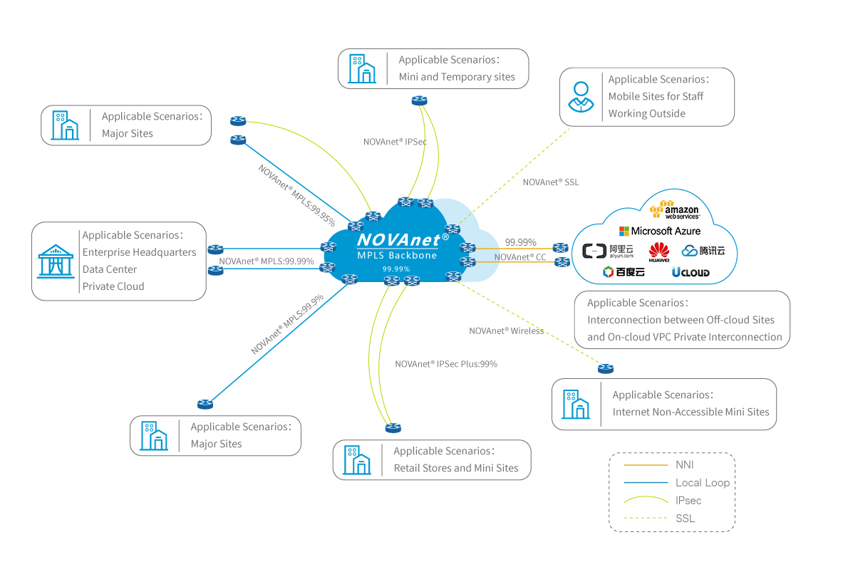 NOVAnet® VPN is the IP-VPN access service products series based on NOVAnet®, "NOVA MPLS backbone network". NOVAnet® VPN provides multiple IP-VPN connection technologies, which can fully connect enterprise headquarters, data centers, cloud computing platforms, and branches or office sites in different regions to realize the interconnection and interoperability and ensure a secured reliable, and efficient data transmission within the enterprise.